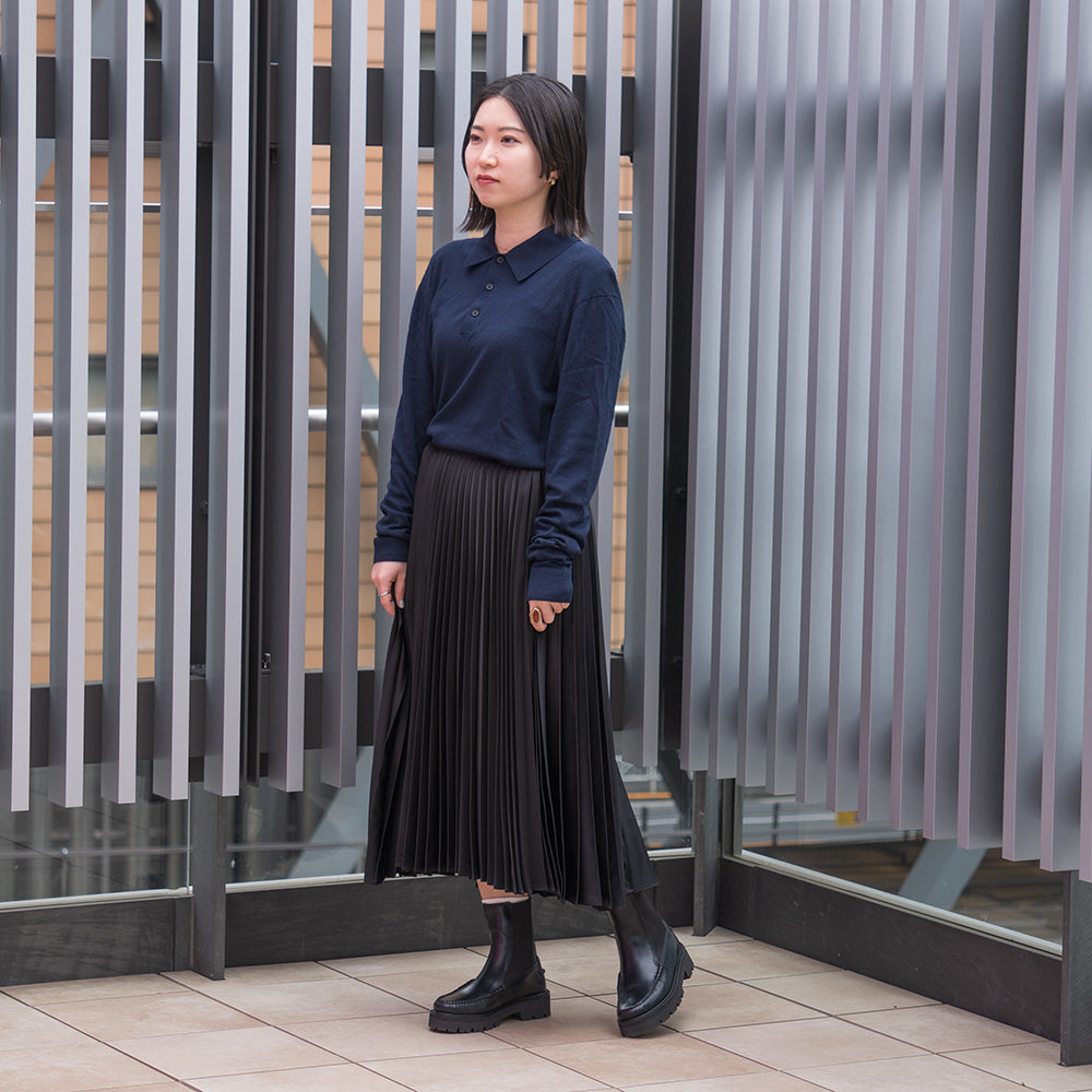 今回、トップスには春らしいハイゲージニットのポロを持ってきました。プリーツのフレアスカートとも相性がよく、デザイン性が高いモカシンタイプのサイドゴアブーツがしっかりと見える丈がポイントのコーディネートです。