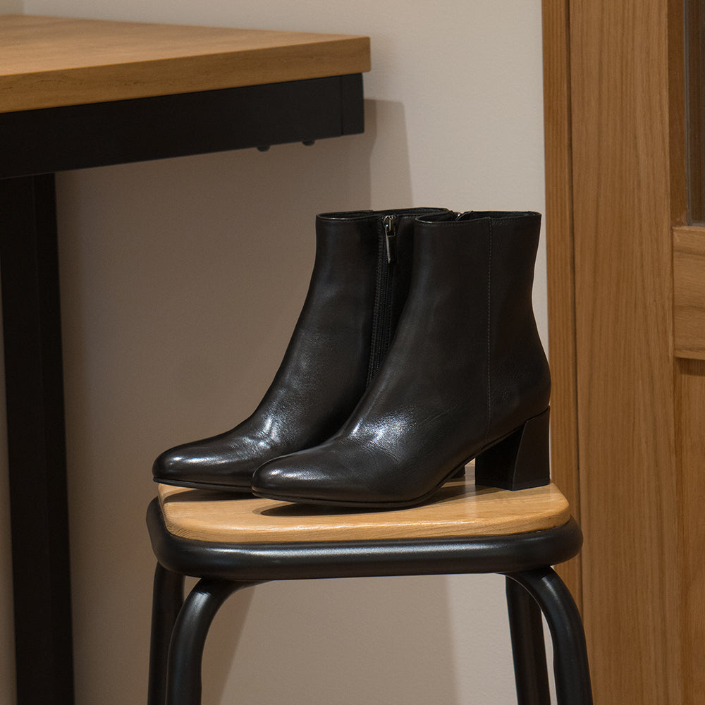 シンプルな黒のジップアップショートブーツは洗練された印象