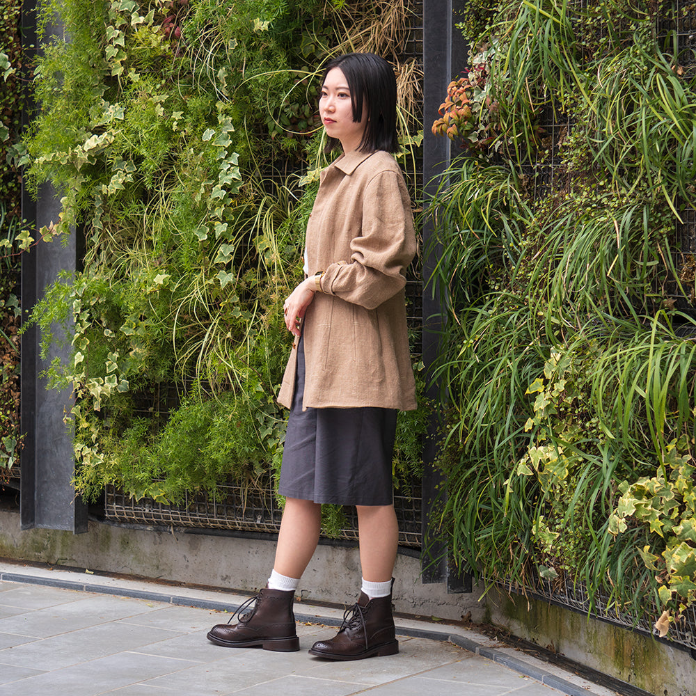 今回合わせたダークブラウンのカラーは足元の引き締め役。春らしく素足を見せるショートパンツの丈と、トリッカーズのレースアップの丈の長さが相性抜群、白い靴下が春らしさを演出します。まだ肌寒さ残る春の季節なので素材感のあるベージュのシャツジャケットを合わせました。インナーにTシャツなどを持ってくれば気温の変化にも対応できてしまいます。