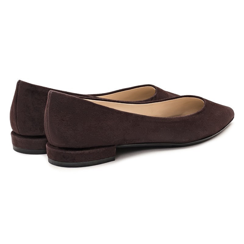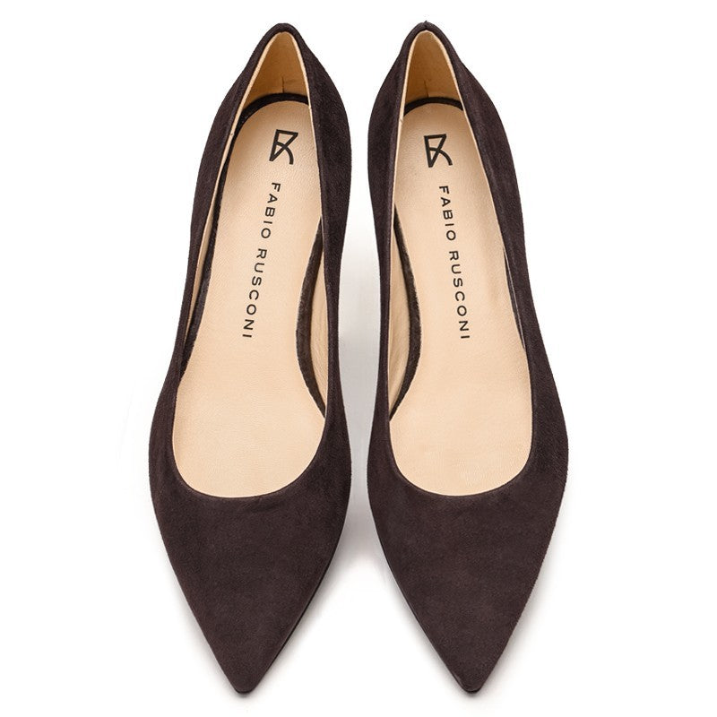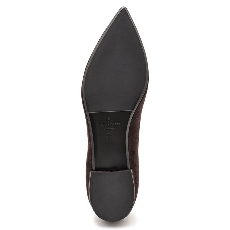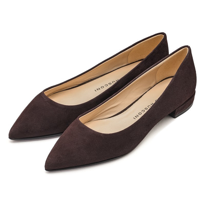 FABIO RUSCONI(ファビオルスコーニ) の、上品で洗練されたローヒールフラットパンプス。柔らかく起毛したスエード素材が足元に優しい質感と深みのある表情を与え、品の良さを演出します。落ち着いたダークブラウンは肌馴染みが良く、スタイリングにも自然に溶け込む万能カラーです。