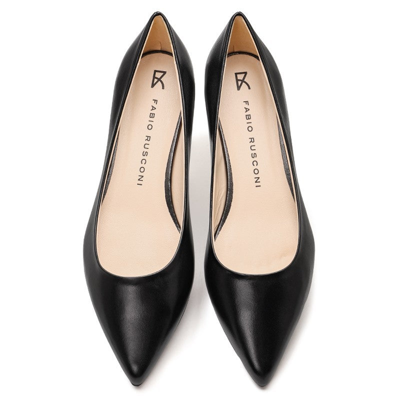 FABIO RUSCONI(ファビオルスコーニ) の、上品で洗練されたローヒールフラットパンプス。柔らかくて張りのある上品なスムースレザー素材が足元に優しい質感と安心感ある表情を与え、品の良さを演出します。定番のブラックは汎用性が高く、スタイリングにも自然に溶け込む万能カラーです。