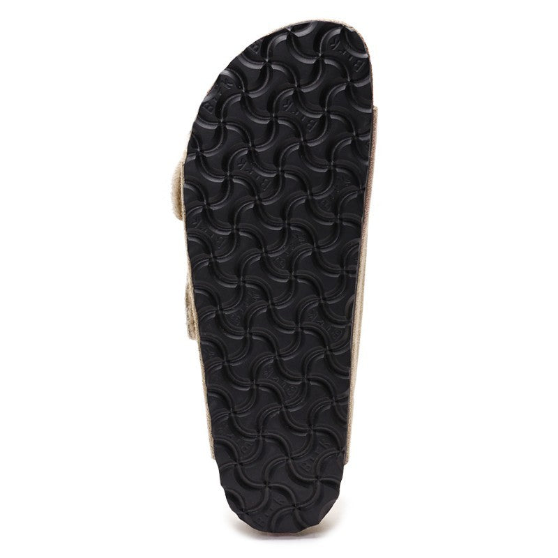 クラシックなダブルストラップデザインに、秋冬らしいぬくもりをプラスしたこのモデルは、シーズンの変わり目にも重宝する万能サンダル。カジュアルなデニムスタイルはもちろん、ウール素材のパンツやリラックスウェアにも相性抜群です。